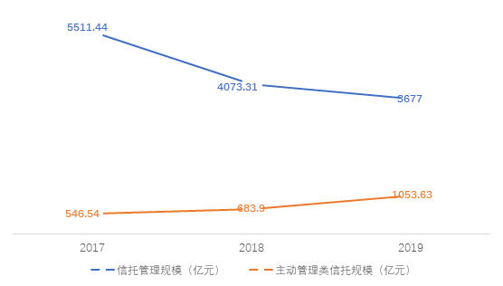 截止2019年末,江苏信托信托规模达到3677亿元,存续主动管理类信托规模1053.63亿元,较年初增加369.73亿元,增长54.06%,主动管理类信托规模占比28.65%,较年初提高了11.86%。而在2017年,公司信托业务管理规模高达5511.44亿元。