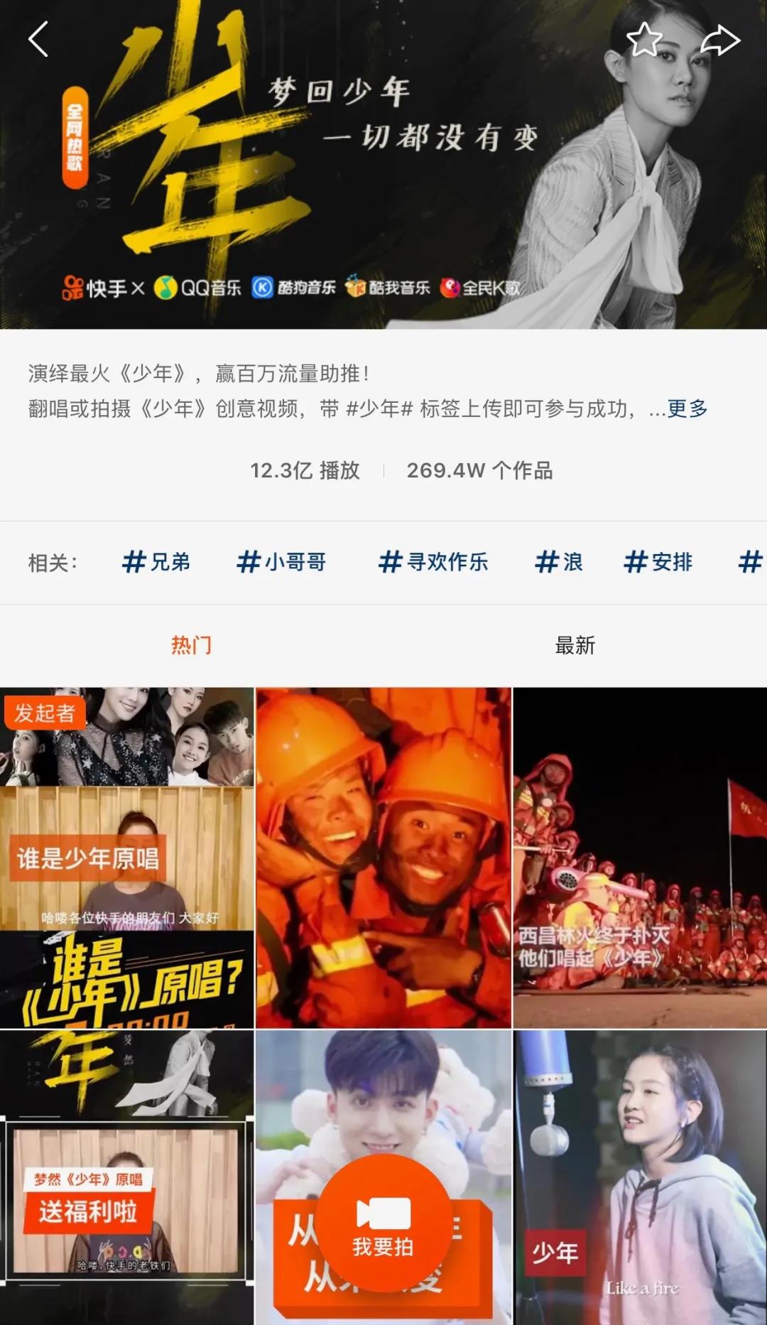 快手也就着《少年》爆款热潮,在4月7日上线“谁是《少年》原唱?”专场,原唱梦然连麦其他音乐主播,平台联合梦然推出创意短视频征集活动,并予以创作者百万流量激励,活动也获得极高的反响,相关话题标签有12.3亿的播放量,超过260万的作品上传。