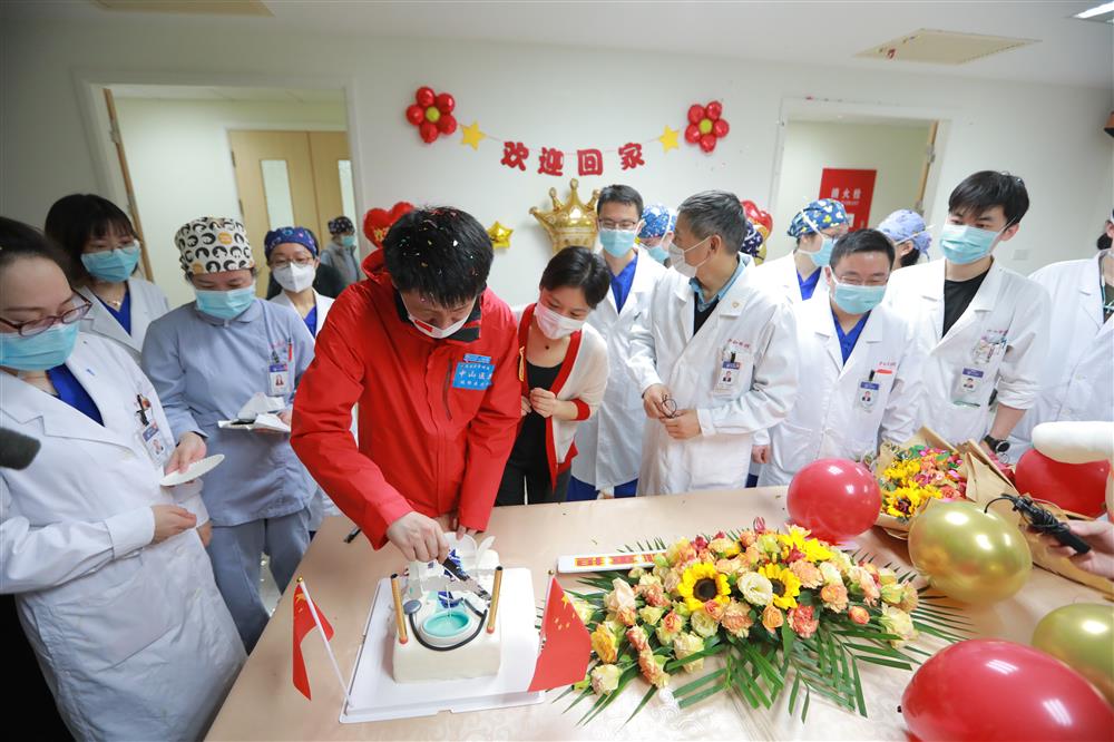 4月20日,钟鸣解除隔离当天回到中山医院,同事们为他接风洗尘。图片来源:复旦大学附属中山医院