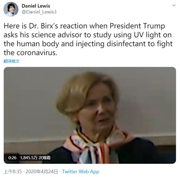 在特朗普做出这番表态时,白宫病毒工作小组协调员伯克斯(Deborah Birx)就坐在讲台侧的椅子上。伯克斯目瞪口呆的表情已经在社交网络上广为流传。
