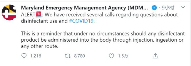 由于热线电话激增,马里兰州应急管理部门不得不在Twitter发文警告民众,在任何情况下都不能注射或者饮用消毒液。