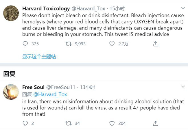 哈佛大学药理学与毒理学部则认真解释了为什么不能注射或者饮用消毒液和漂白剂。推文写道:注射漂白剂会引发溶血,也就是红细胞破裂,造成肝脏损伤。而消毒液则会造成胃部严重灼伤和出血。