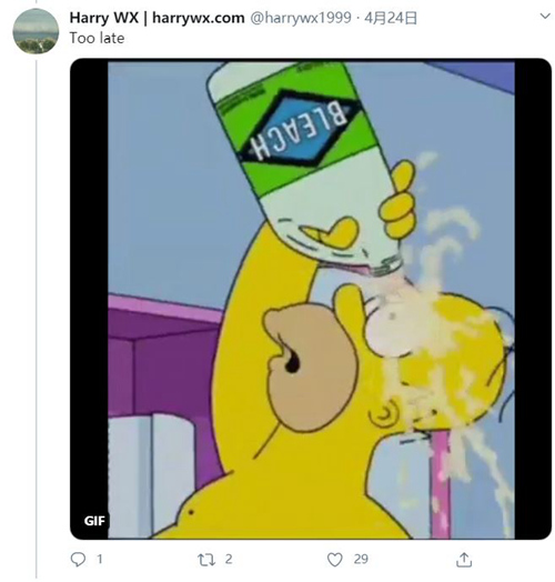 还有网友用动画片《辛普森一家》中漂白剂洗眼睛的截图调侃:太晚了。