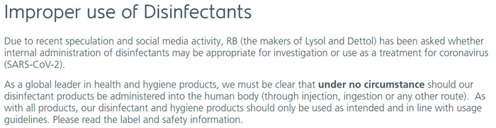 担忧顾客错误使用产品而引发纠纷,生产滴露和Lysol的英国利洁时公司以及美国清洁消毒巨头高乐氏公司均发表声明,告诫顾客不要误用消毒产品。利洁时公司的声明强调,“在任何情况下”,都不能向体内注射或饮用该公司的消毒产品。