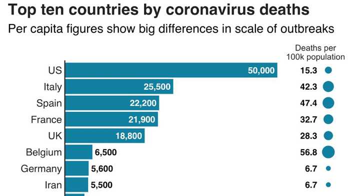 BBC报道则指出,虽然美国是全球新冠死亡最多的国家,按照死亡人数在全国总人口中的占比来看,美国(人口3.3亿)的死亡率低于西班牙、意大利、法国等国。