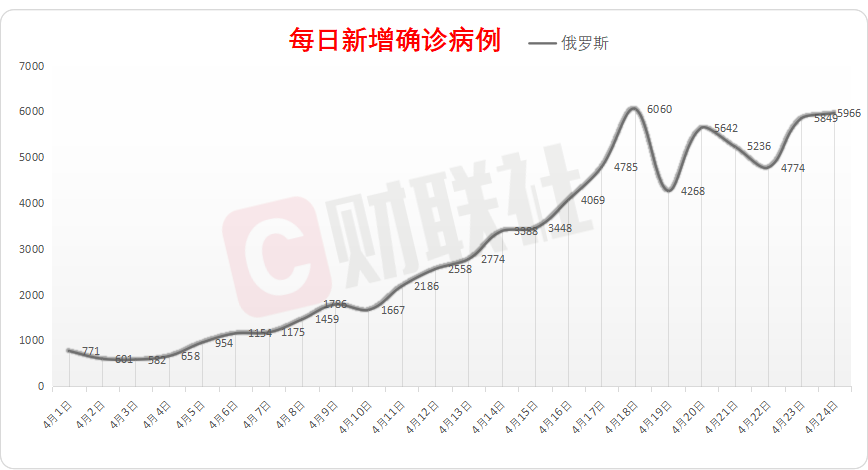 据俄罗斯新冠病毒防疫官网消息,截至当地时间4月25日13时15分,俄罗斯境内单日新增新冠肺炎确诊病例5966例,累计确诊病例74588 例。