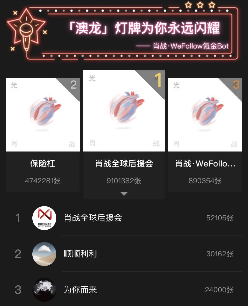 在QQ音乐英雄榜上,贡献居首位的是“肖战全球后援会”,它买下了9088613张数字专辑,因此获得了在平台上展示应援牌的机会。酷狗音乐上设计了“支持肖战全新数字专辑,解锁独家福利”的玩法。粉丝只要购买4张专辑,还可以解锁肖战专属感谢语音。酷我音乐上是类似的玩法,专辑销量达成“钻石唱片”就可以升级为公益活动,以肖战之名向24所贫困小学发起捐赠,目前该活动的进度已经超过75%。