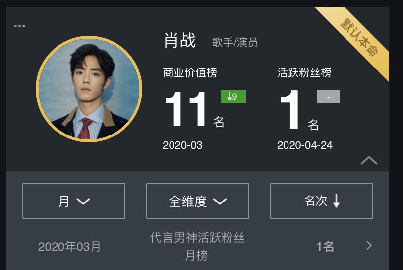 但如果单看3月的明星商业价值榜单,肖战已经滑落至11位。