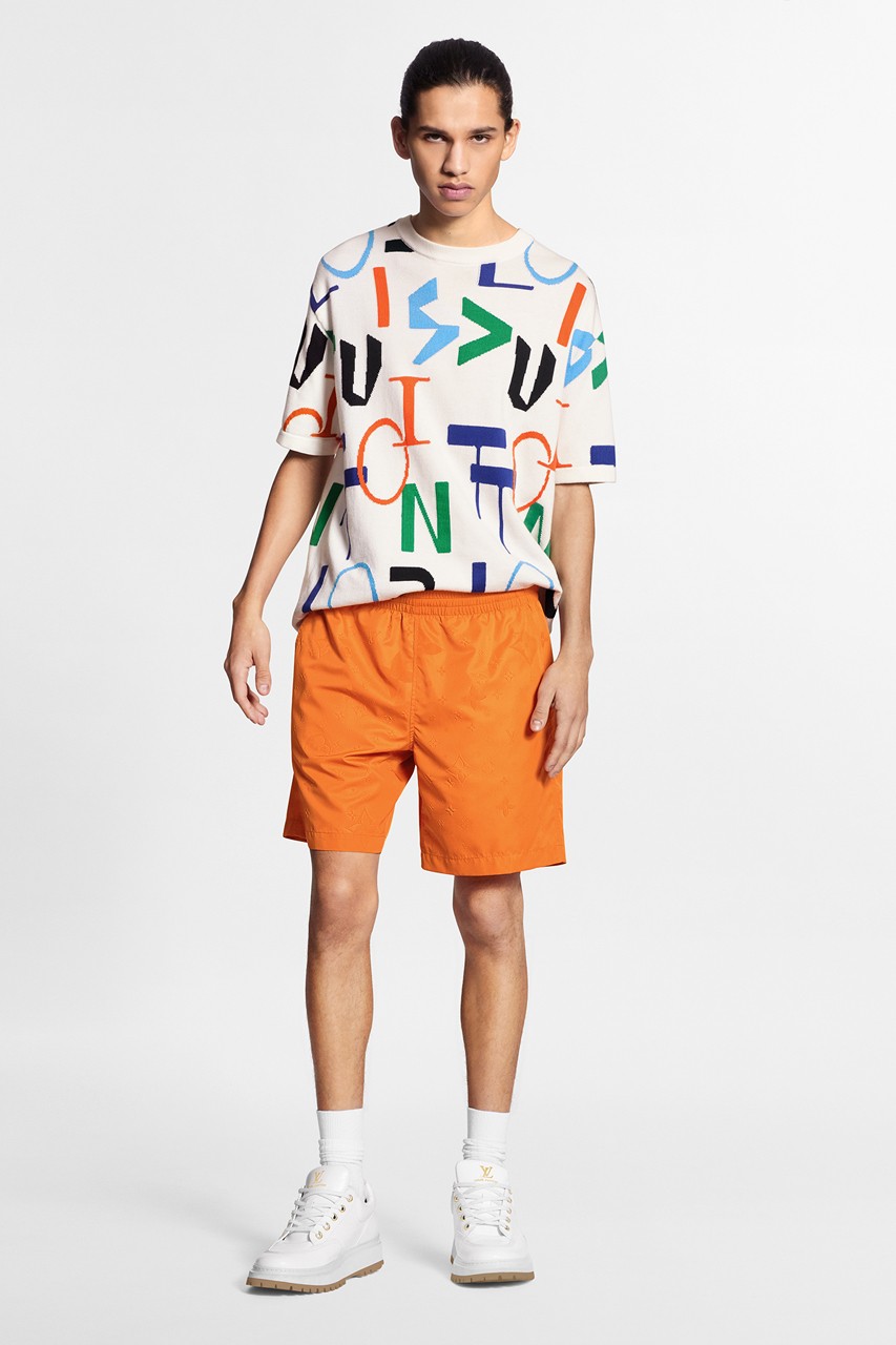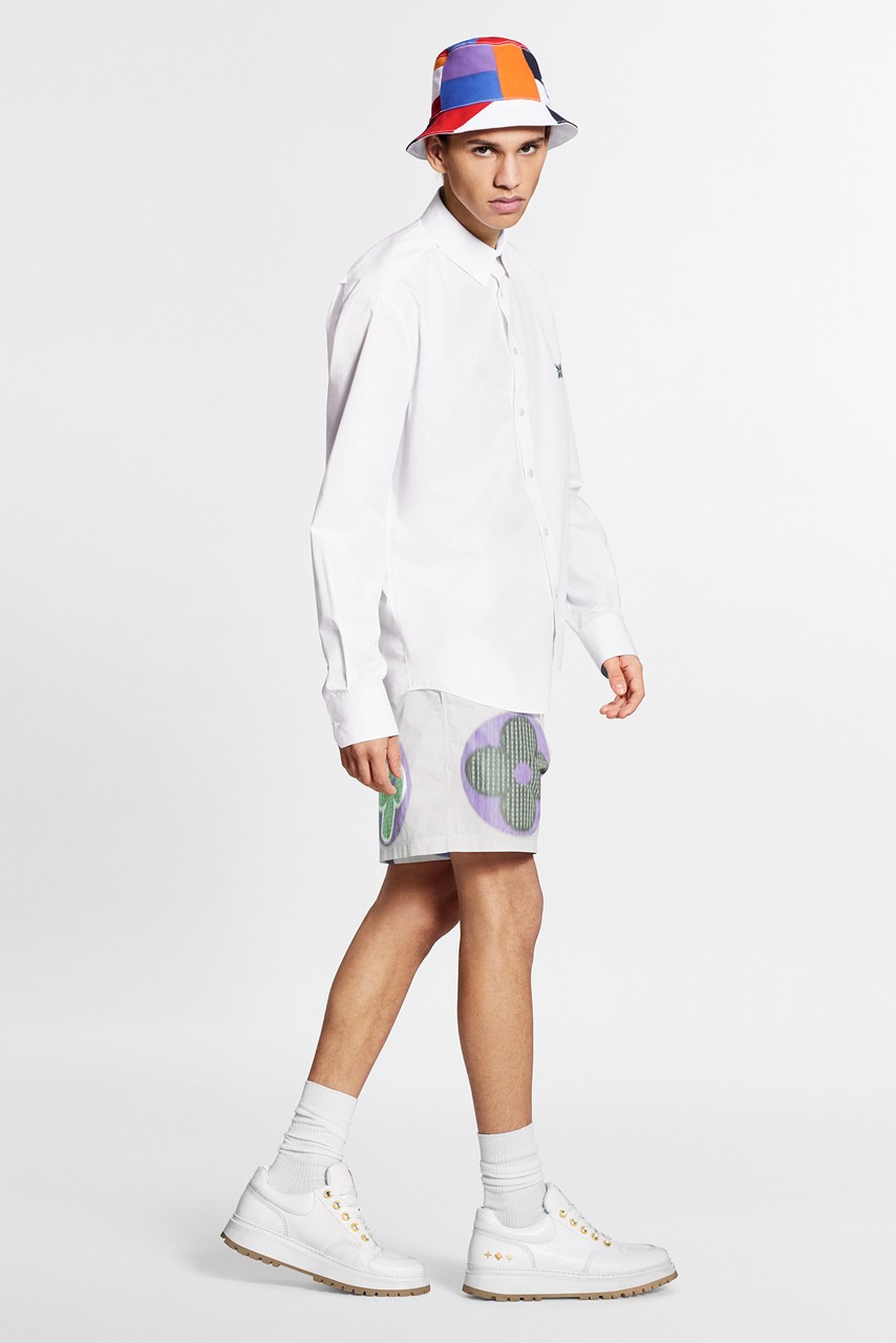 从Louis Vuitton在社交媒体平台上释出的照片来看,硕大的缤纷Monogram印花无疑是这个系列最引人注目的地方。从连帽运动卫衣、宽松沙滩裤、白色针织毛衣再到短袖衬衫,布满面料上的Monogram多彩花朵图案似乎在时刻宣告“这就是Louis Vuitton”,而这也是Virgil Abloh最为喜爱的创作手法。