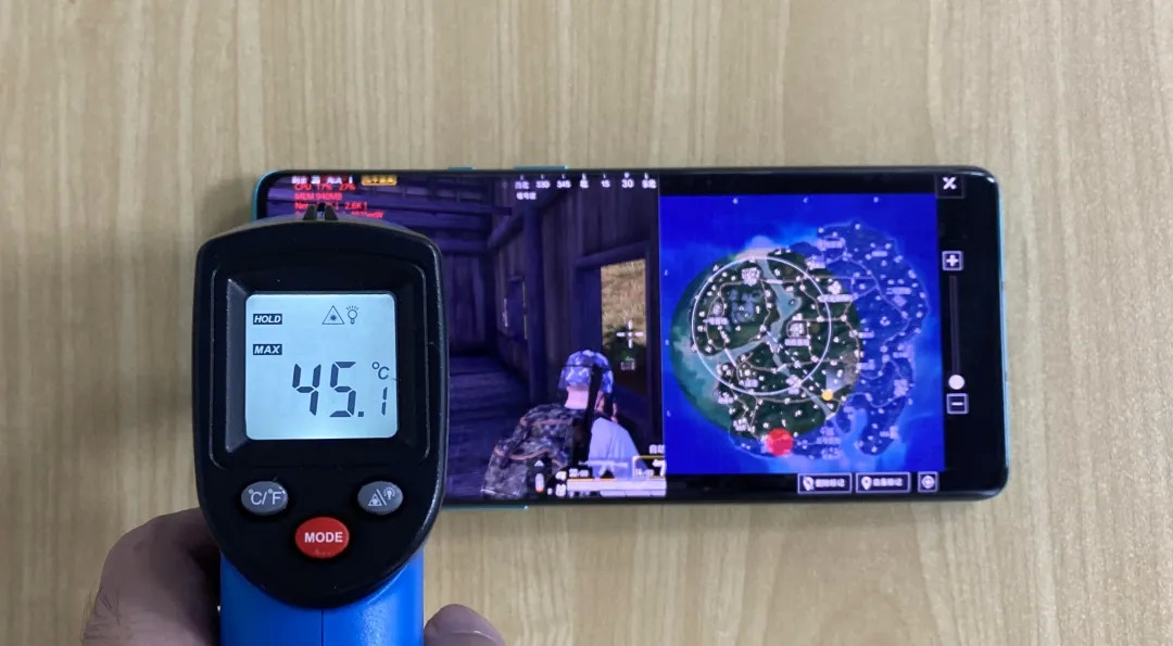 此时,机身表面的温度已经飙至45.1,掌托部位可以很明显地感觉到烫手。