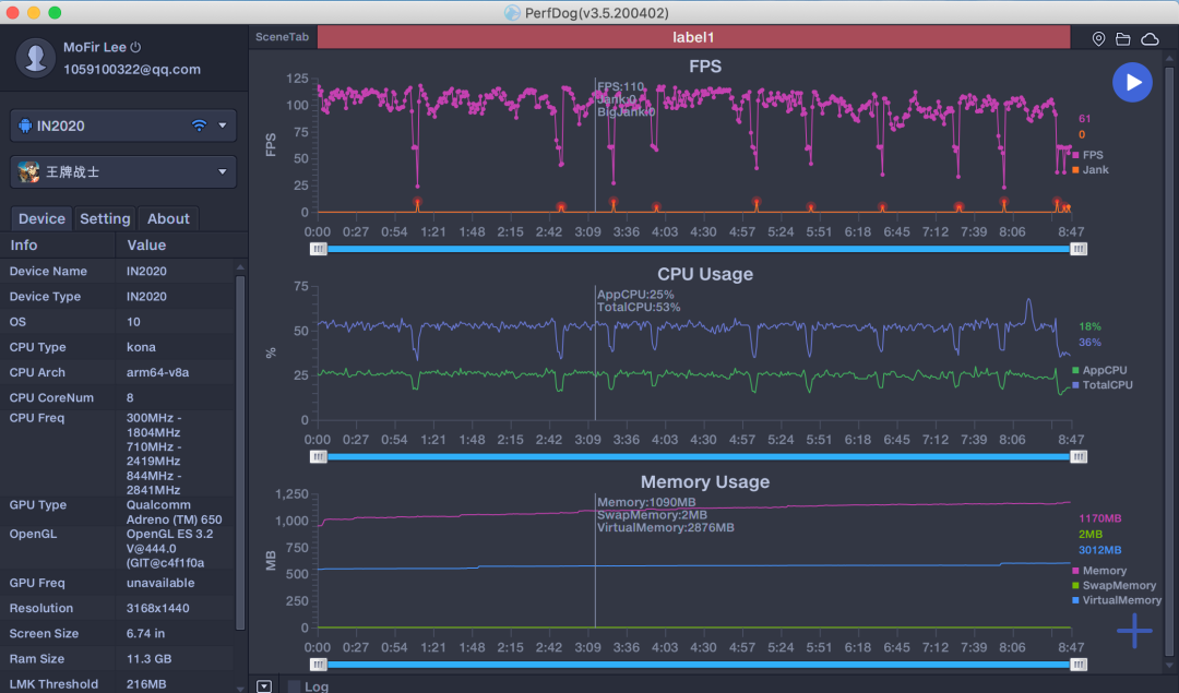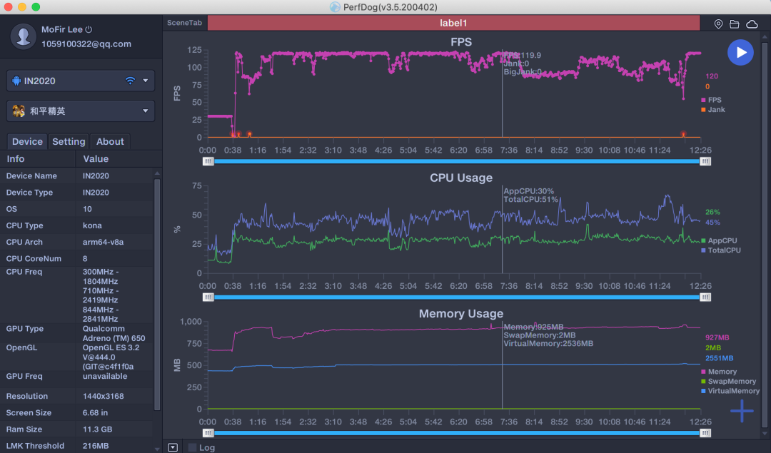 《和平精英》解锁120Hz后,特效全开,我们可以看到8分钟之前,游戏帧率波动幅度没那么大,在那之后由于机身过热,导致CPU降频,使得画面的帧率跌至80帧左右。