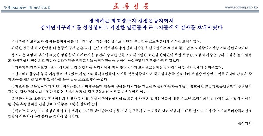 据朝鲜劳动党机关报《劳动新闻》26日报道,朝鲜最高领导人金正恩向支援三池渊建设的工作人员表示感谢。收到来自金正恩的谢意,当地工作人员感到无比光荣,表示将以更高的热情投入建设工作。