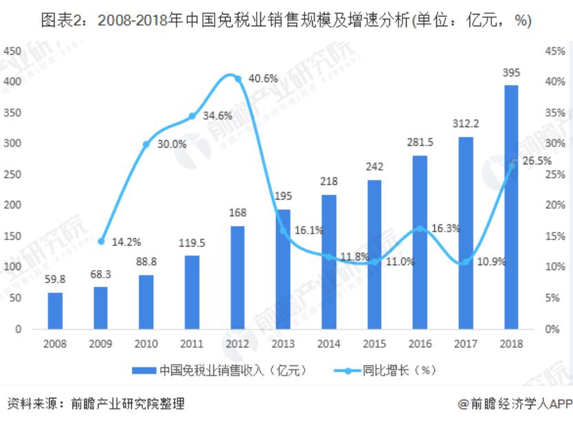 根据前瞻产业研究院分析,2008-2018年,中国免税业销售收入呈现逐年增长的态势。其中,2016年,中国免税业销售收入281.5亿元人民币,超越英国和美国,成为全球第二的免税大国。中国免税品(集团)有限责任公司发布的数据则显示,2018年中国免税业销售收入达到395亿元,同比增长26.5%。