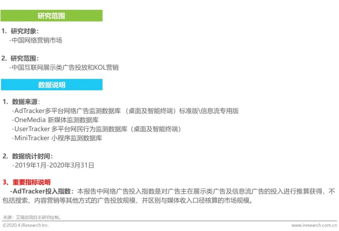 《2020年中国网络营销投放监测系列报告》基于艾瑞十七年对互联网流量研究的研究经验、数据积累,结合AdTracker多平台网络广告监测数据库和艾瑞新媒体市场监测工具OneMedia的监测数据,以2020年开年疫情危机下的网络营销市场动向为研究主题,从数据角度展现展示类广告、信息流广告、KOL营销相关数据趋势。结合具体品牌营销案例进行分析;然后就后疫情时代网络广告营销动向进行总结,最后给出Q1广告主和品牌投入的相关榜单。希望能为相关企业提供参考意见。