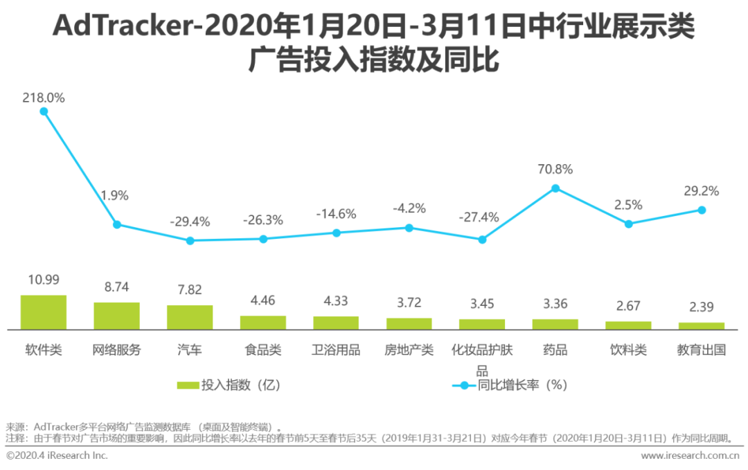 疫情期间,展示类广告市场的支柱行业由交通行业和化妆品护肤品行业转变为IT产品和网络服务行业。IT产品类的广告投入指数同比增长率高达163.9%,医疗服务和教育出国类也应疫情需求而加大广告投放,投入指数同比增长率排进TOP3。从中行业数据看,软件类、网络服务类取代汽车和食品类成为展示类广告的新支柱。另外,在疫情期间,药品行业的投入指数同比增长率也高达70.8%。