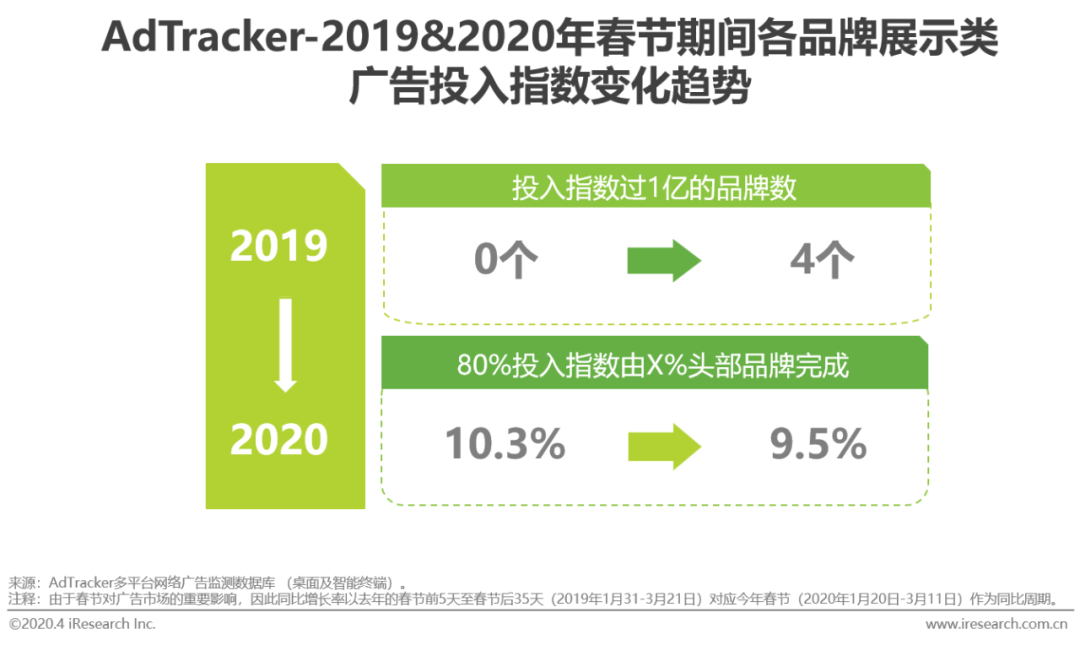 在疫情引起经济骤冷的形势下,头部品牌并未缩减展示类广告的投入,反而加大对这种传统广告的投入,进一步拉开梯队间差距。2020年的“春节档+疫情周期”与2019年的“春节档”相比,投入指数过亿的企业从0个增加为4个,整个展示类广告市场中80%的投入由头部9.5%的品牌完成,强者越强的格局正在拉大。优质的展示类广告投放频道和呈现方式可以在获取消费者注意力的同时更增添品牌资产。