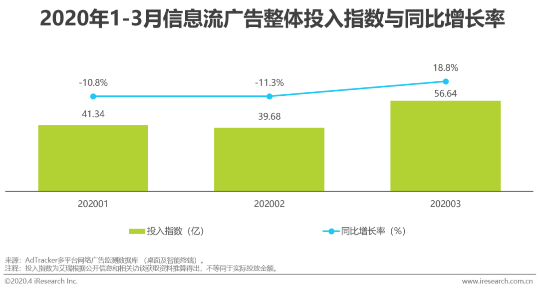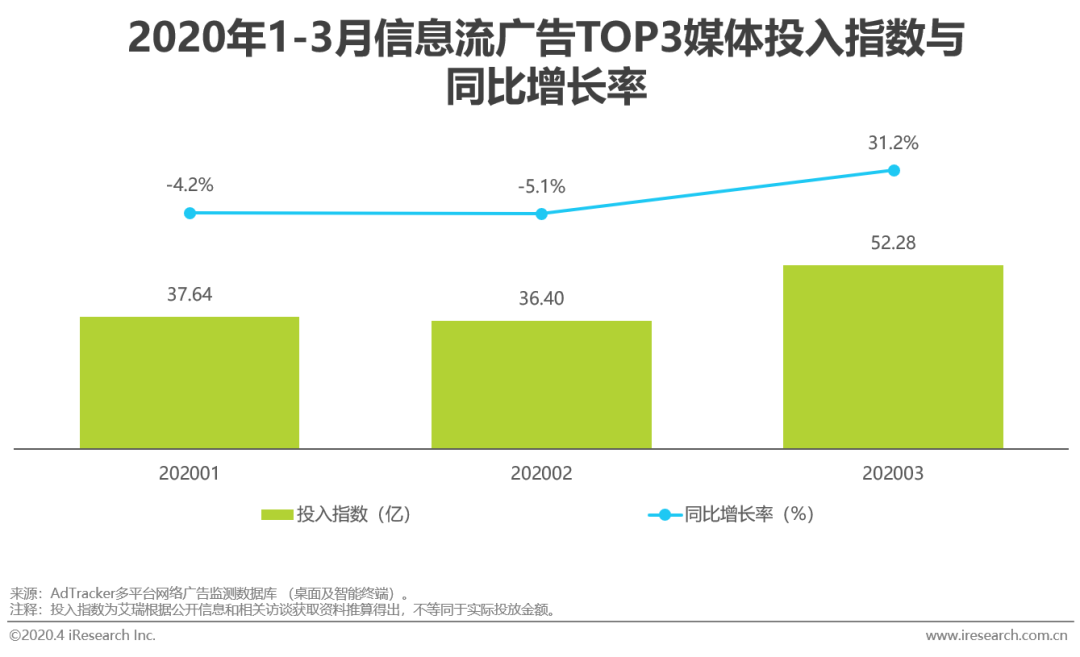 信息流广告能根据用户标签画像进行定向投放,形式上短小精悍,能够降低用户抵触心理,因此近年来一直受到广告主青睐。2020年Q1,信息流广告在经受了经济降温带来的打击后强力反弹,3月的广告投入指数高达56.64亿,同比增长了18.8%。信息流广告的头部媒体在Q1的投入指数同比增长率反弹势能更为强劲,投入指数TOP3媒体的同比增长率均在20%以上,环比增长率25%以上。