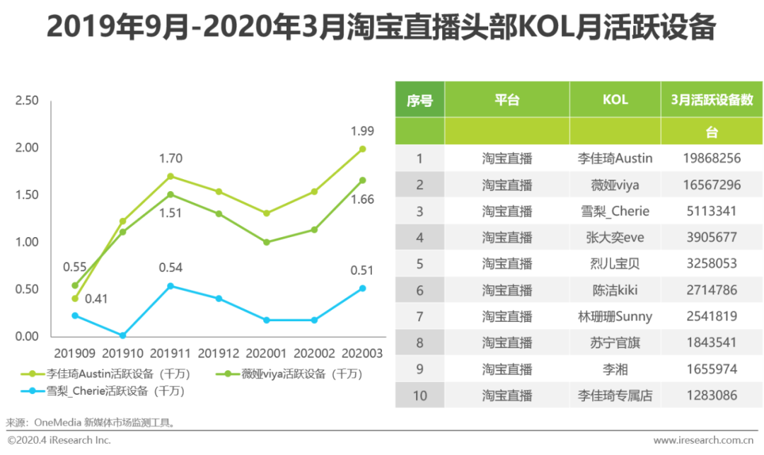 根据艾瑞新媒体市场监测工具OneMedia的监测数据,淘宝直播头部KOL如李佳琦和薇娅从2019年9月-11月的三个月内猛增幅度约3倍,KOL直播带货成为热潮。但是淘宝直播体系内KOL的流量结构来看,近半年以来的顶流KOL只有薇娅和李佳琦,2019年9月排在第3的雪梨目前粉丝数和李佳琦的活跃设备数差距悬殊。经过6个月的发展后,从2020年3月的数据来看,排在第3的雪梨_Cherie与李佳琦的活跃设备J继续拉大差距,目前相差约1.5千万。这一方面意味着淘系生态中的主播发展天花板很高,发展潜力无限;但另一方面也因为淘宝直播中顶流KOL的稀缺,整体呈现出仅有头部但缺乏肩部和腰部的格局。