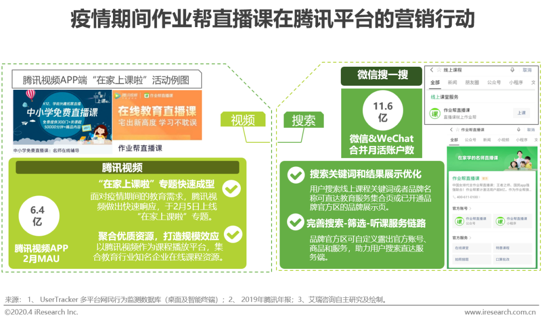 疫情期间,家校师生对线上课程的需求涌现,1月29日,教育部公布使用网络平台“停课不停学”的建议。腾讯迅速行动响应,率先于2月5日在腾讯视频上线“在家上课啦”专题页。根据艾瑞mUserTracker数据显示,腾讯视频仅APP端2月MAU即高达6.4亿,利用其流量优势搭建在线教育企业的优质课程平台,为教育品牌带来资源集中展示平台和用户规模效应。同时,微信搜一搜也加强线上课程服务的搜索和结果优化,用户可通过搜索品牌名称,直接进入已开通品牌官方区的品牌展示页面,更好地帮助教育品牌触达用户,实现教育用户和教育企业的双赢。