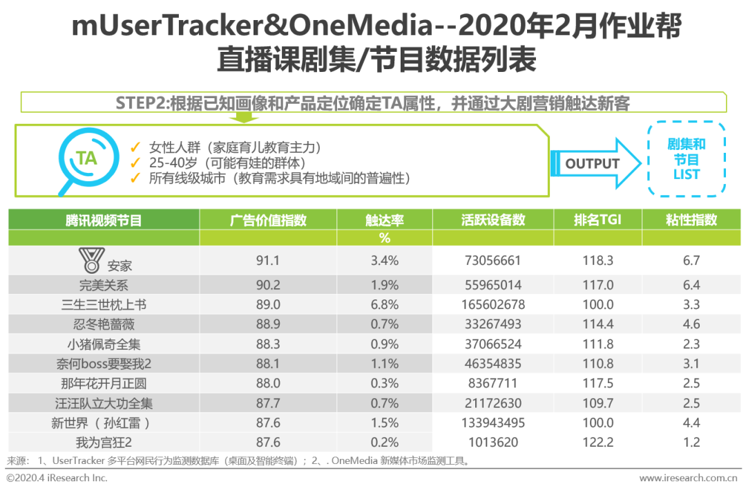 好的营销活动第一步就是以数据精准定位出目标人群,通过对作业帮直播课APP用户画像数据的分析结果和教育产品的功能定位可以得出热播剧《安家》是最适合教育品牌进行大剧营销的剧集。作业帮直播课在腾讯视频平台中契合《安家》剧情进行无痕植入,抢占用户心智,与受众用户迅速建立情感共鸣,提升用户对作业帮直播课的品牌认知度和好感度。