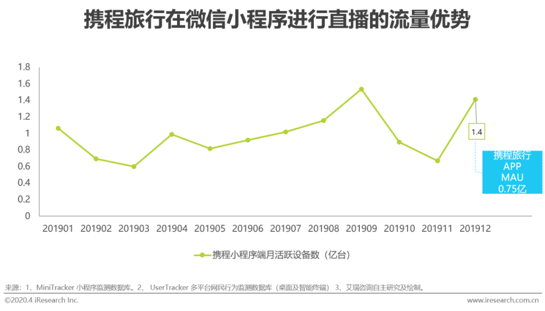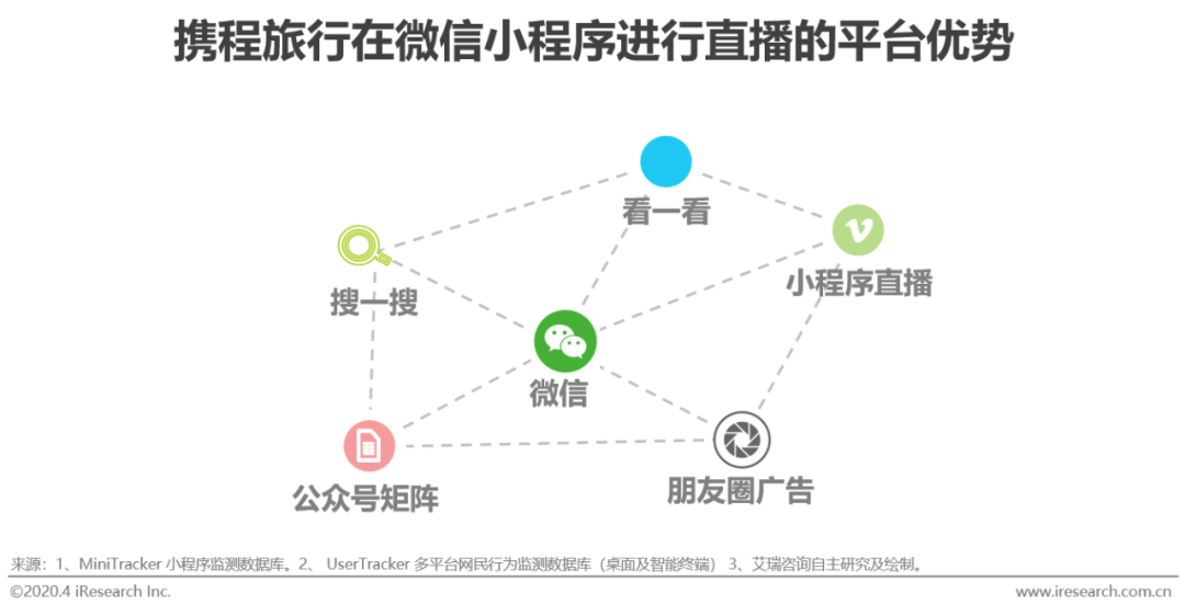 随着国内疫情好转,旅游行业回暖在即。根据艾瑞发布的《润物有声Ⅳ 中国互联网年度流量报告》,从2019年在线旅游全年流量趋势看,在线旅行的流量主战场已经从APP端转移到微信小程序端,2019年12月,携程旅行官方小程序MAU高达1.4亿,在微信小程序端加强私域流量的运营成为最佳选择。并且小程序直播能够更好地嵌入微信平台的流量阵地优势,发挥微信平台社交优势,携程旅行借助微信内的朋友圈广告、公众号和搜一搜引流完成用户吸引,小程序H5页直接承接服务,完成吸引-触达-转化的交易闭环。
