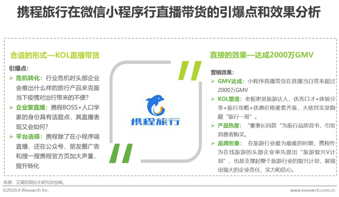 3月25日起,携程旅行在微信小程序端连续推出“携程董事长住过的酒店首次揭秘”、”携程董事长对话神秘嘉宾“、“花好粤明惊喜不停”多期直播。直播是携程在疫情影响下转化行业危机之举,企业家直播赚足眼球。从直播的效果来看,微信小程序端的直播页面更为简洁,具有活动分享、点赞评论、抽奖优惠、购物等关键功能;另外,携程BOSS梁建章的直播带货表现远超预期,从其优秀口才+体验分享+旅行攻略+优惠价格直播的要素来看,大佬其实是隐藏“旅行一哥”与专业主播之间的配合很好地把控住直播带货的节奏;最终,直接达成的带货效果是直播当日GMV超过2000万。