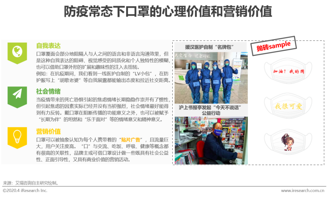 在新冠病毒全球大流行的形势下,中国也将处于防疫常态中,口罩将会与每个人的生活相伴。品牌主可借势营销联合口罩厂商为社会提供一些注入文化内涵的口罩商品,既能起到提升社会情绪氛围的作用,也能提升品牌的正面形象输出。