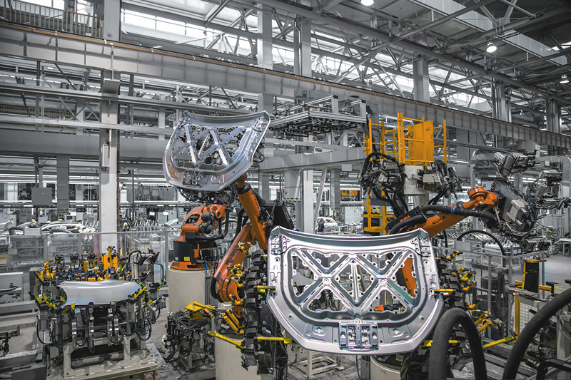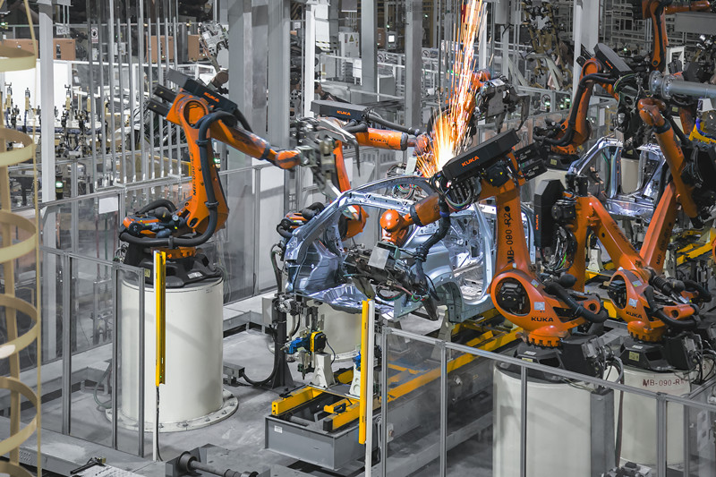 在焊接车间,主要由一条柔性化主线和一条刚性主线和车身储运线构成,并首次采用4车型柔性线,自动化率达50%。
