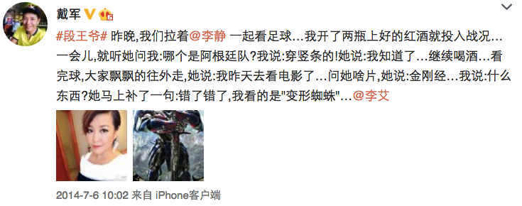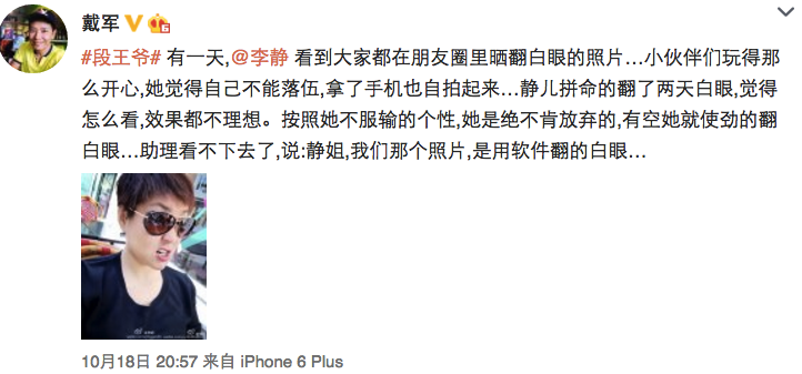 在娱乐圈,戴军是个多面手,出过唱片、当过主持、闲来还写写专栏。在微博上,他还是个勤奋的段子手,创作内容以自己《超级访问》搭档李静的段子为主,因此也有了“段王爷”的称号。