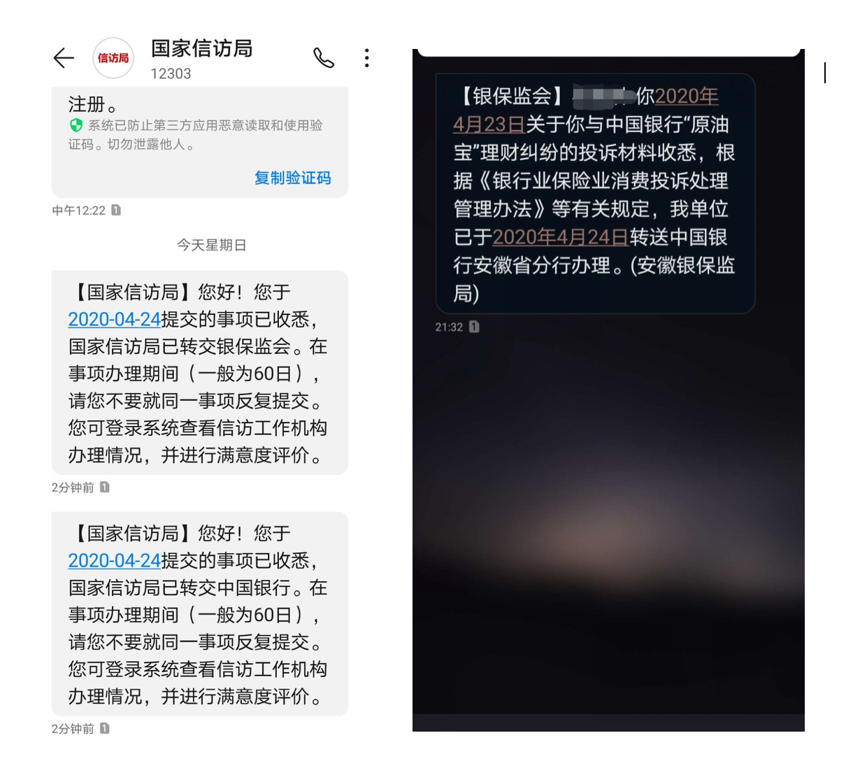 来自银保监会地方分局的回复短信也称,已经收悉其于4月23日提交的与中国银行“原油宝”理财纠纷的投诉材料,根据《银行业保险业消费投诉处理管理办法》等有关规定,银保监会已转送给中国银行当地分行办理。