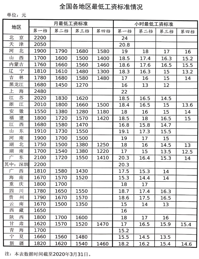 4月26日人社部发布全国各地区最低工资标准情况(数据截至2020年3月31日),上海月最低工资标准全国最高为2480元,北京为2200元,广东为2100元,其中深圳为2200元。