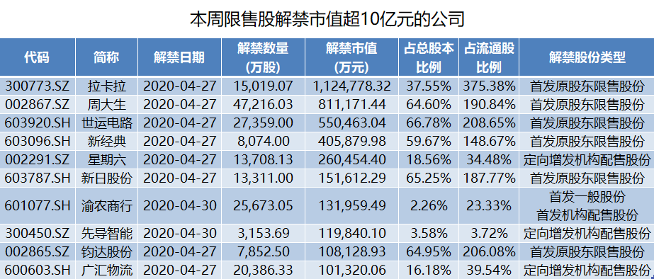 同时,解禁市值超过10亿元的上市公司合计有10家,除拉卡拉一家上百亿元解禁市值外,周大生、世运电路、新经典(603096.SH)解禁市值超过40亿元。