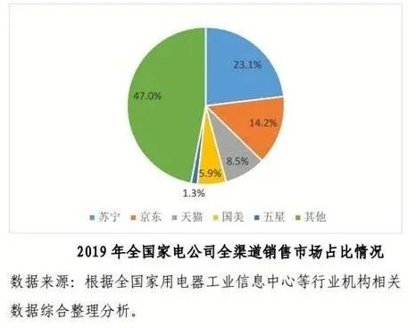 从全渠道市场份额来看,据《2020年家电消费趋势报告》显示,2019年苏宁家电全渠道市场份额达23.1%,位居市场首位;位居第二、三位的分别为京东(市占率14.2%)和天猫(市占率8.5%);而国美的这一数字仅为5.9%,位居第四。