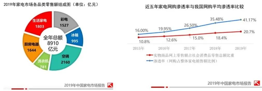 这种说法是基于权威机构的数据支撑——今年2月,中国电子信息产业发展研究院发布《2019年中国家电市场报告》显示,2019年,我国家电市场零售额规模达到8910亿元,线上渠道对家电销售的贡献率达到41.17%。此外,受疫情影响,2020年我国家电市场不确定性进一步增加,但线上销售将持续增长,渗透率有望达到50%。