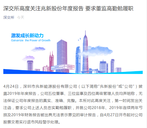 深交所在文章中表示“对此高度关注,第一时间发出关注函,要求公司上述人员忠实勤勉履职,并就公司2018年、2019年连续两年亏损及2019年财务报告被出具无法表示意见的审计报告,自4月27日开市起对公司股票交易实行退市风险警示处理”。