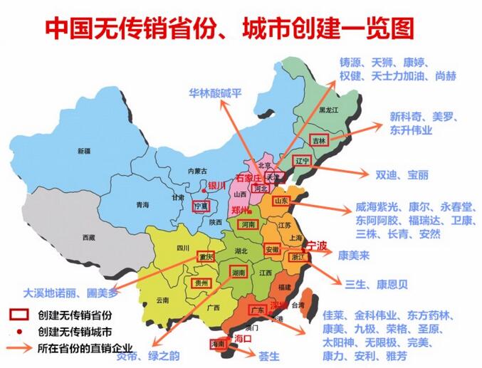 全国目前共有14个省份、6个重大城市在创建无传销区域。东部沿海地区较多,华中地区较为滞后,东北、西南总共四个,西北地区仅宁夏回族自治区一省。