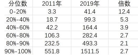 如果光是看央行报告的表格,资产分布差距确实很大,但更重要的是这个分布的变化。我们将2011年CHFS微观数据用本次2019年央行调查的同一个口径计算不同分位人口的平均家庭资产,可以得到下表: