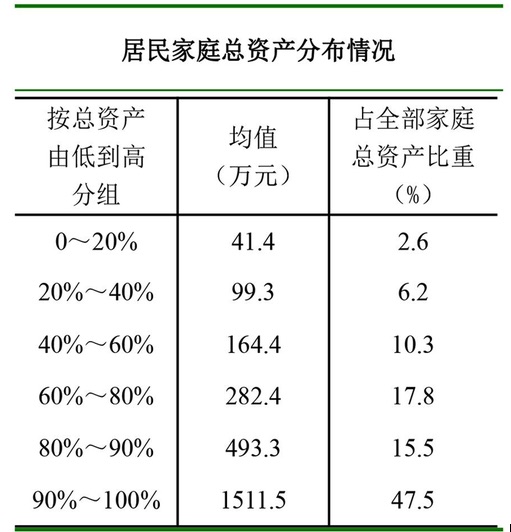 中国的贫富差距究竟有多大?近日央行公布的报告《2019年中国城镇居民家庭资产负债情况调查》给出了一个参考。这份于2019年10月中下旬对3万余户城镇居民家庭开展的资产负债情况调查发现,城镇居民家庭资产分布十分不均等:总资产最高的前10%的城镇家庭的平均资产达到了1511.5万元,占所有城镇居民家庭资产的近一半;而总资产最低的后20%城镇家庭户均资产仅有41.4万元,占所有家庭比重的2.6%。