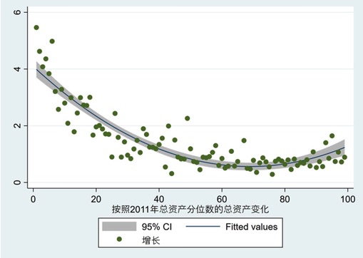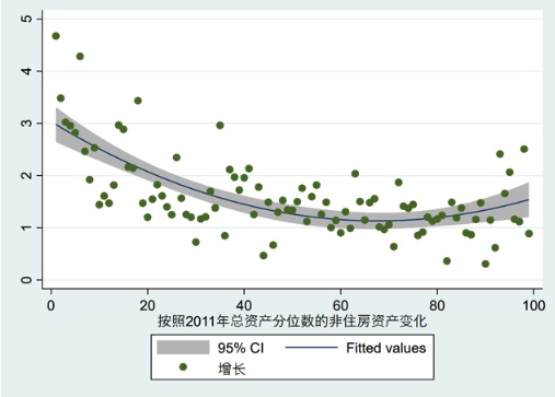 上图的横轴显示了这4752户家庭按照2011年资产分位数排列,0为2011年的最低资产,100表示2011年的最高资产。纵轴表示2017年的总资产除以2011年总资产的对数。
