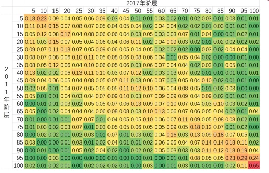 我们用2011年到2017年的CHFS追踪数据计算了一张资产分位数转移矩阵,下图的纵向表示2011年的净资产阶层,横向表示2017年的净资产阶层,都分为20个分位数。每一个格子的数字表示2011年处于横向阶层时,2017年处于每一个纵向阶层的概率。比如第一行第一列的0.18,表示一个人要是在2011年处于最低一层,那么2017年时他只有0.18的概率还处于最低一层。