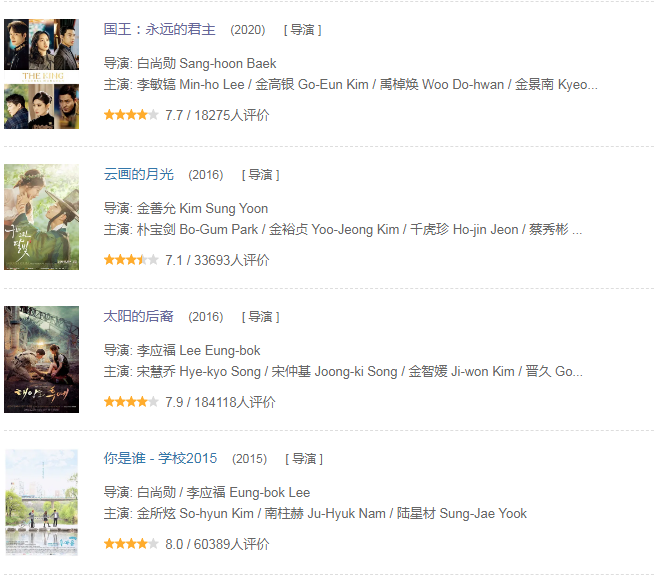 和金银淑搭档过《太阳的后裔》的导演白尚勋,豆瓣高分韩剧《秘密》、《你是谁—学校2015》出自他手;
