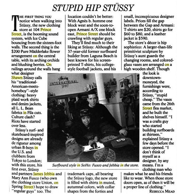 辗转至90年代,纽约以滑板与Hip-hop为主的亚文化热潮,在经历80年代的摸索后得到了空前的爆发,仍在引领当时全球潮流的步伐,正式迈入“黄金年代”的街头。于1980年成立的滑板品牌Stussy在80年代街头扎下根基,实属前辈级别。看了以上的文字,大家也知道了主理人Shawn Stussy与藤原浩的关系,以及间接对于里原宿文化的影响。几乎在同期的纽约,美裔英国人James Jebbia在Spring大街开了一家,贩卖英国品牌以及Stussy的买手店Union NYC,因此与Shawn Stussy结识,并于之后的90年代初期,两人携手合作于Prince街,开启了一间由Shawn命名的古董店,后由于Shawn的退出,James Jebbia在无奈之中,产生另起炉灶的想法,正式于1994年成立了风靡至今的Supreme。