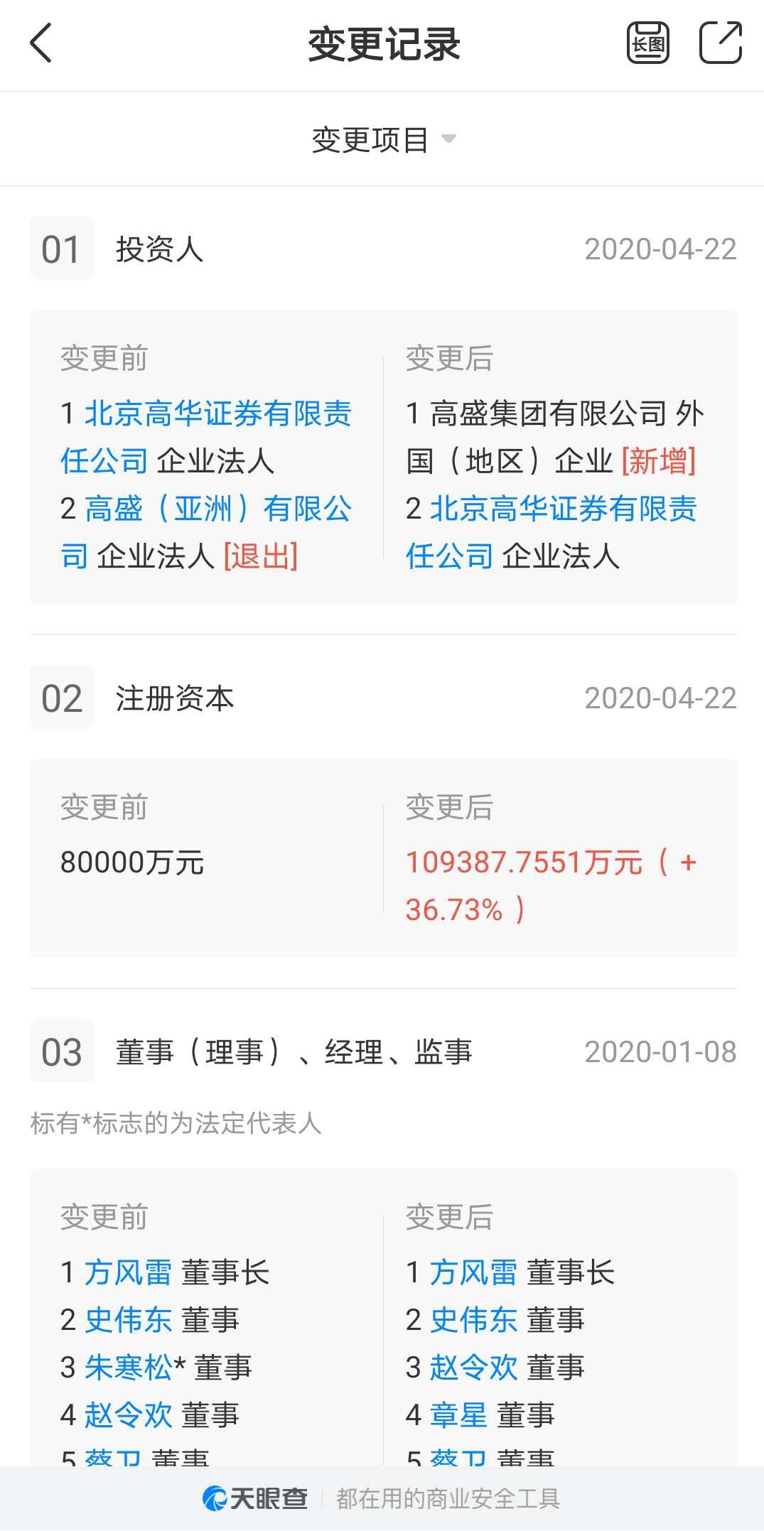 4月26日,天眼查数据显示,高盛高华证券工商信息于日前发生变更,高盛集团取代高盛(亚洲)成为外方股东,股权比例上,高盛集团持股比例增至51%,北京高华证券持股比例变为49%。公司注册资本由8亿元变更为10.94亿元,增幅36.73%。