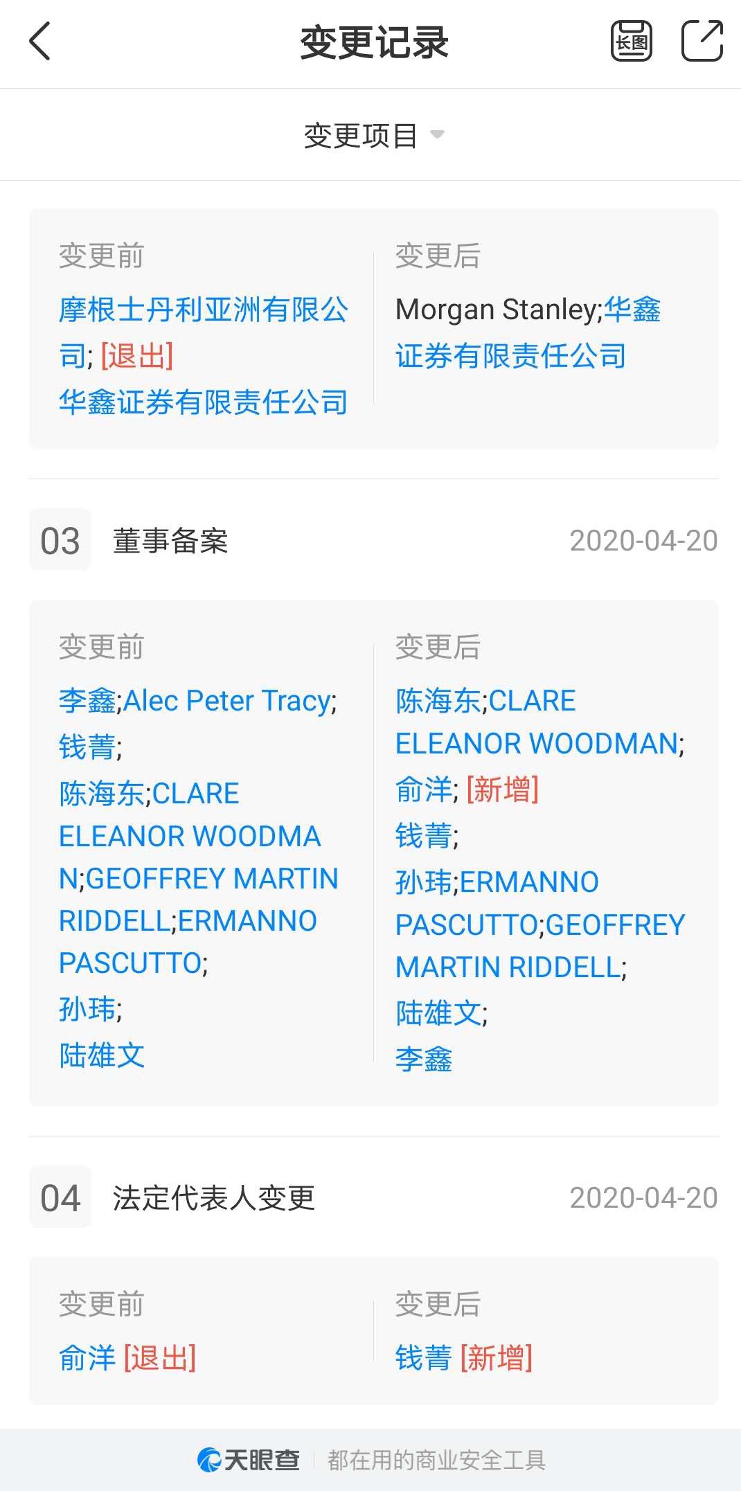 券商中国记者也发现,摩根士丹利华鑫证券的股权信息也于日前发生了变更,摩根士丹利取代摩根士丹利亚洲成为外方股东,法定代表人由俞洋变更为钱菁,钱菁在摩根士丹利华鑫证券担任董事、总经理,且在摩根士丹利担任董事总经理。