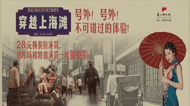 象山影视城大型沉浸式体验秀,让你一秒穿越上海滩,感受海派文化的浓情。仅需28元,你就可以get到剧组同款拍摄服装,身临其境体验原汁原味的老上海风情,还能与演员一起拍摄大电影,获得出镜的机会!