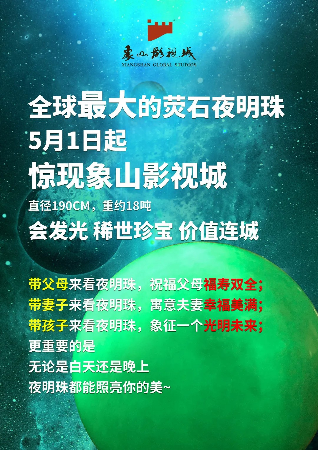 “皎洁圆明内外通,清光似照水晶宫”,夜明珠在中国传统文化中有祈福纳吉、祛灾除疫,寄托对未来的美好愿景。象山影视城也希望借由本次机会联合全球最大的夜明珠,为大家行吉祥好运,集四方昌盛,为你2020年福气加持!