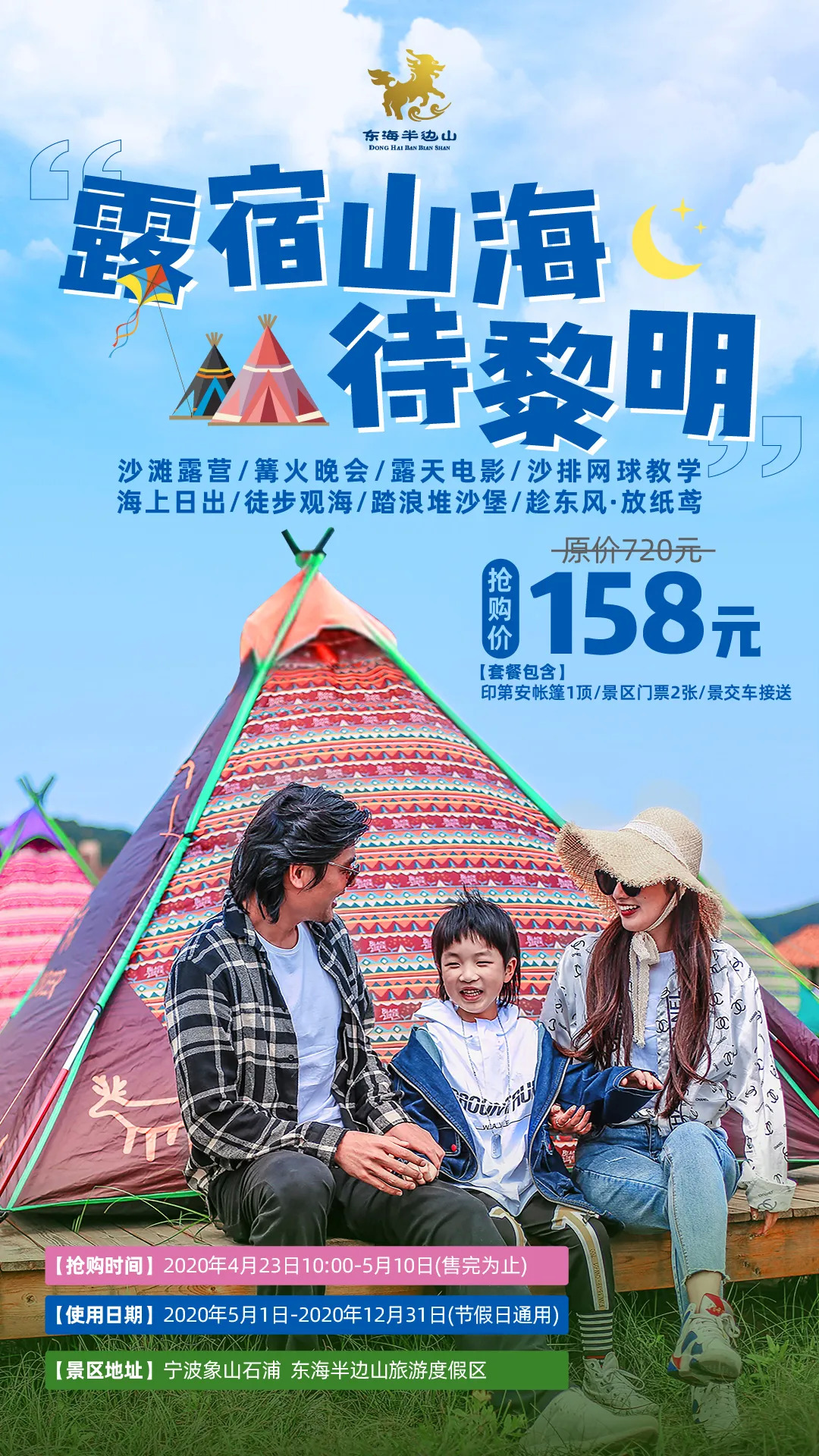活动内容:推出158元帐篷套餐。体验一次海边露营,在星斗阑干的夜晚,只有涛声阵阵,这片刻宁静和浪漫似乎更适合与身边最爱的人分享。