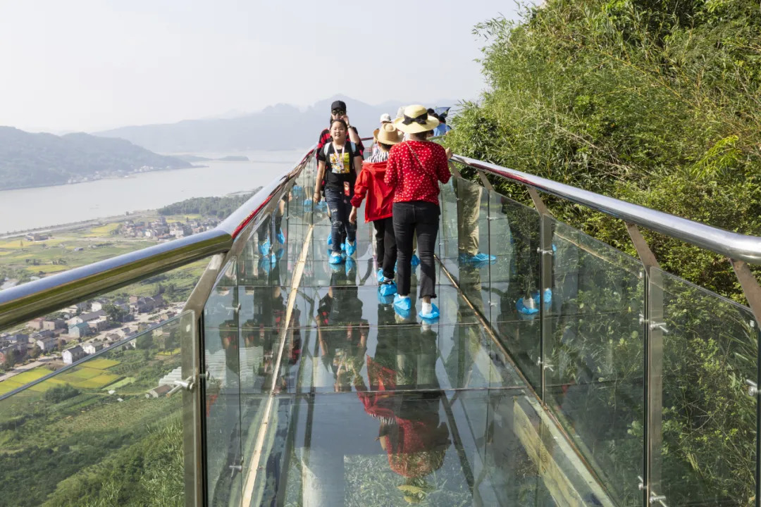 沿着白岩山登山游步道上来,百株梅花像是一条红色长龙直达观海平台,站在海景平台上,远可眺大目湾海上日出,近可观蟹钳港日落,玻璃栈道更能让游客一览蟹钳港全貌,同时感受玻璃栈道的刺激。