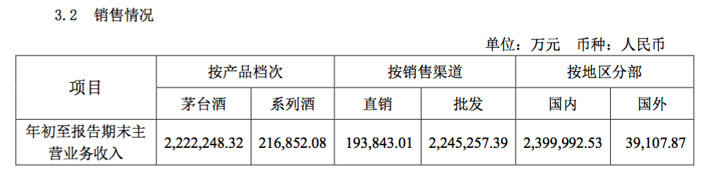 报告期内,茅台酒实现营收222.23亿元,系列酒实现营收21.69亿元;按销售渠道来分,直销渠道实现营收19.38亿元,批发渠道实现营收224.53亿元。