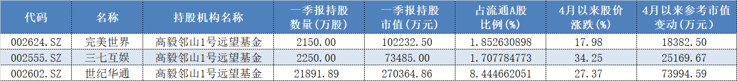 Wind数据显示,截至一季度末,冯柳掌舵的“高毅邻山一号远望基金”一共出现在三只游戏股的前十大流通股东之列,分别是世纪华通、完美世界以及三七互娱,合计的持股市值高达44.61亿元。自4月以来,上述三股分别上涨17.98%、34.25%和 27.37%。